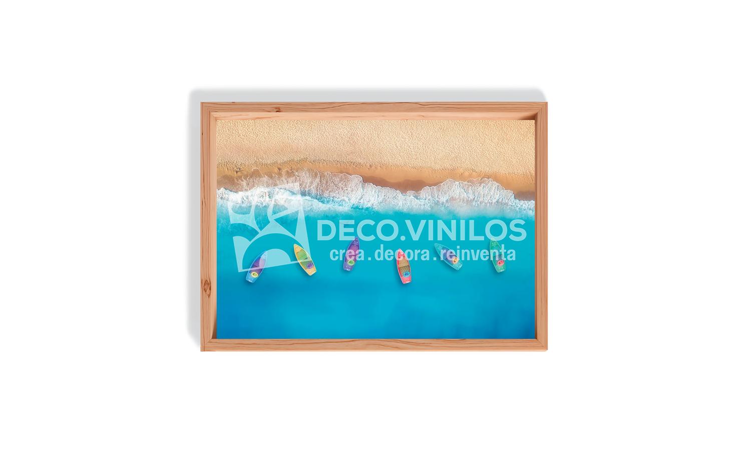 Los cuadros se imprimen en cinco tamaños diferentes, puedes elegir uno de acuerdo a la pared donde será colocado. El material base es un vinil textil de 100 micras, parecido al lienzo, o un vinil simple liso. Para el montaje tenemos dos opciones, el simple con soporte posterior, o un montaje con marco de madera color natural.
